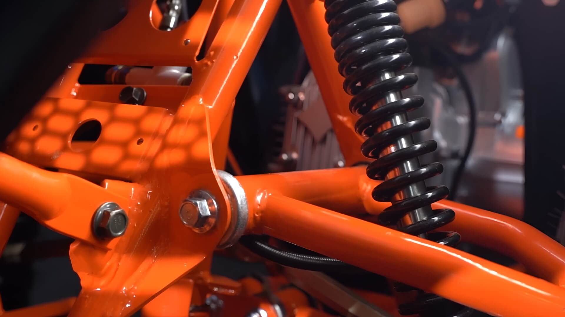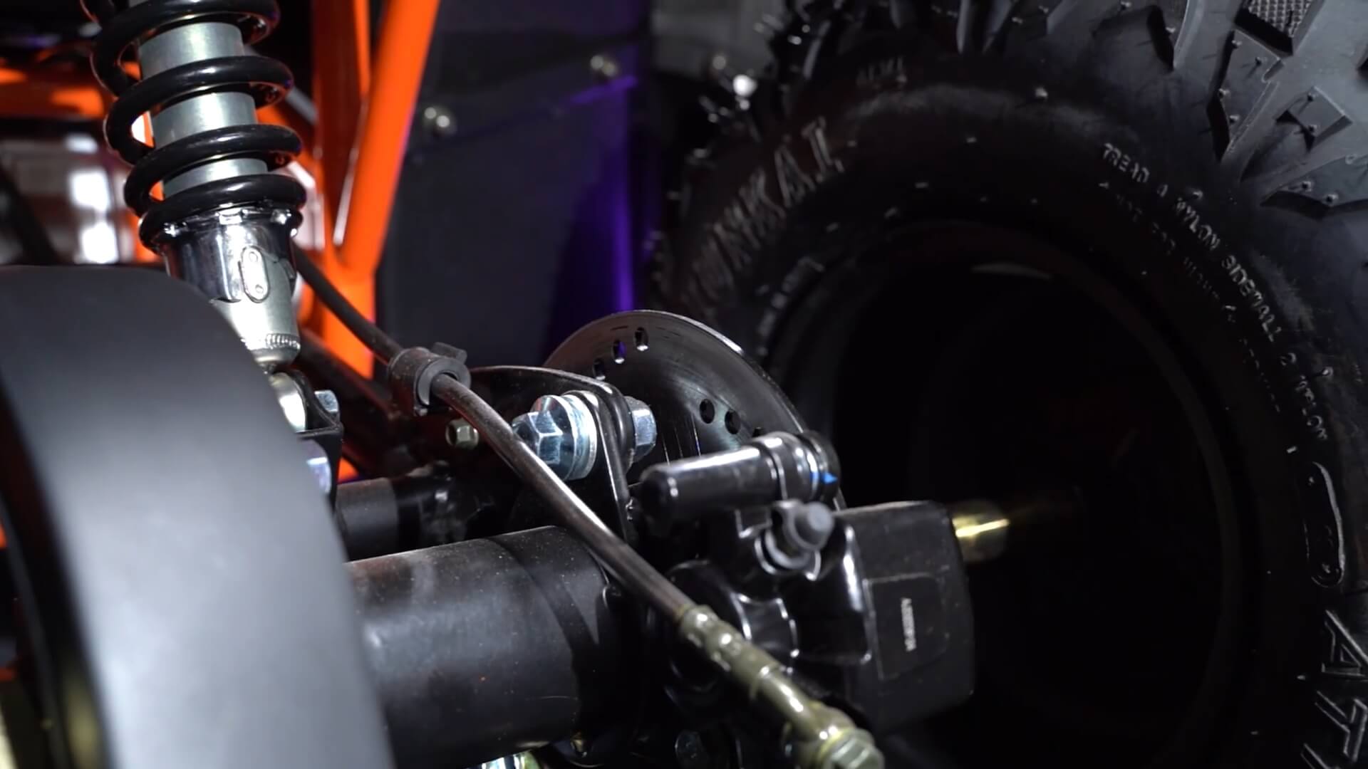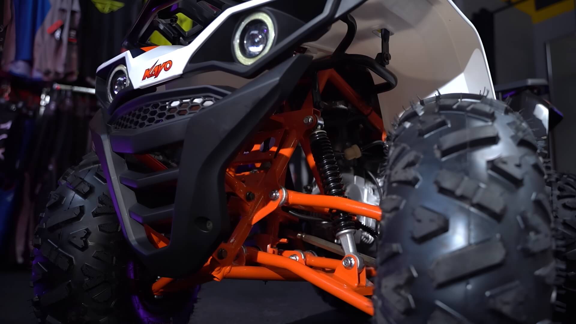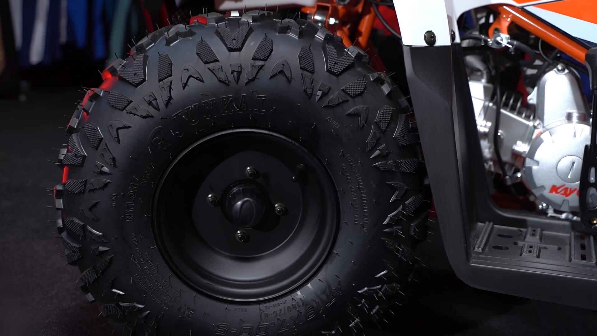 Диаметр колёс 8 дюймов. Подвеска спереди и сзади представлена амортизаторами длиной 265 мм. За торможение отвечает дисковая гидравлическая система.