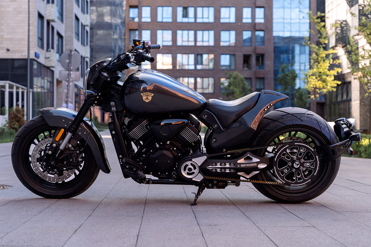 Мотоцикл GROZA Wolverine 800 – ультимативный круизёр, который будто бы сошёл со страниц эксклюзивного каталога кастом-байков. Росомаха (англ. Wolverine) – одно из самых свирепых, ловких и бескомпромиссных хищников в животном мире. Пилотируя этот байк, вы не имеете шанса остаться в потоке незамеченным. А в случае, если кто-то на светофоре решит посостязаться в дрэг-рейсинге, 800-кубовый V-твин и гигантская задняя покрышка не оставят преследователям никаких шансов. 2-цилиндровый 4-тактный двигатель способен обеспечить мощность в 61 л.с. и разогнать аппарат до 160 км/ч.