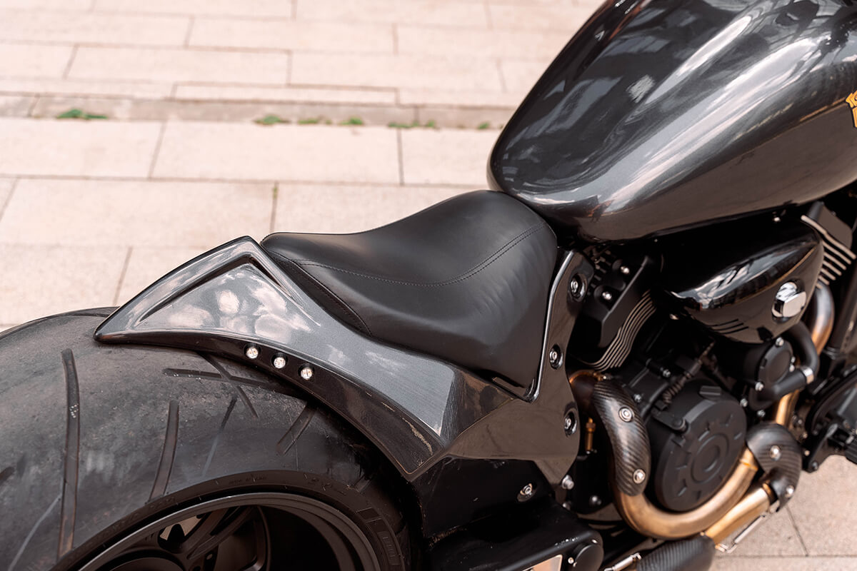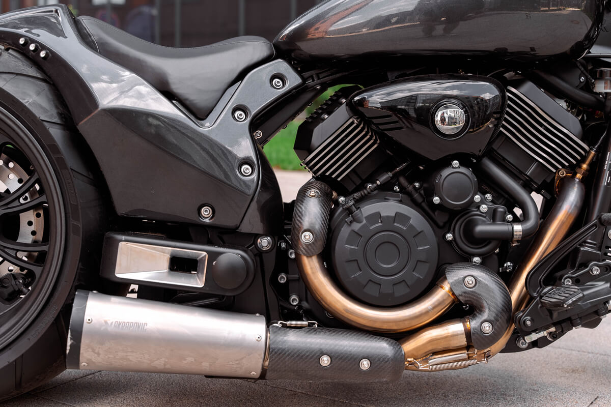 На мотоцикле используются ультраминималистичный хвостовой обтекатель и легендарный «ракетный» глушитель AKRAPOVIC с карбоновыми щитками для защиты ноги.