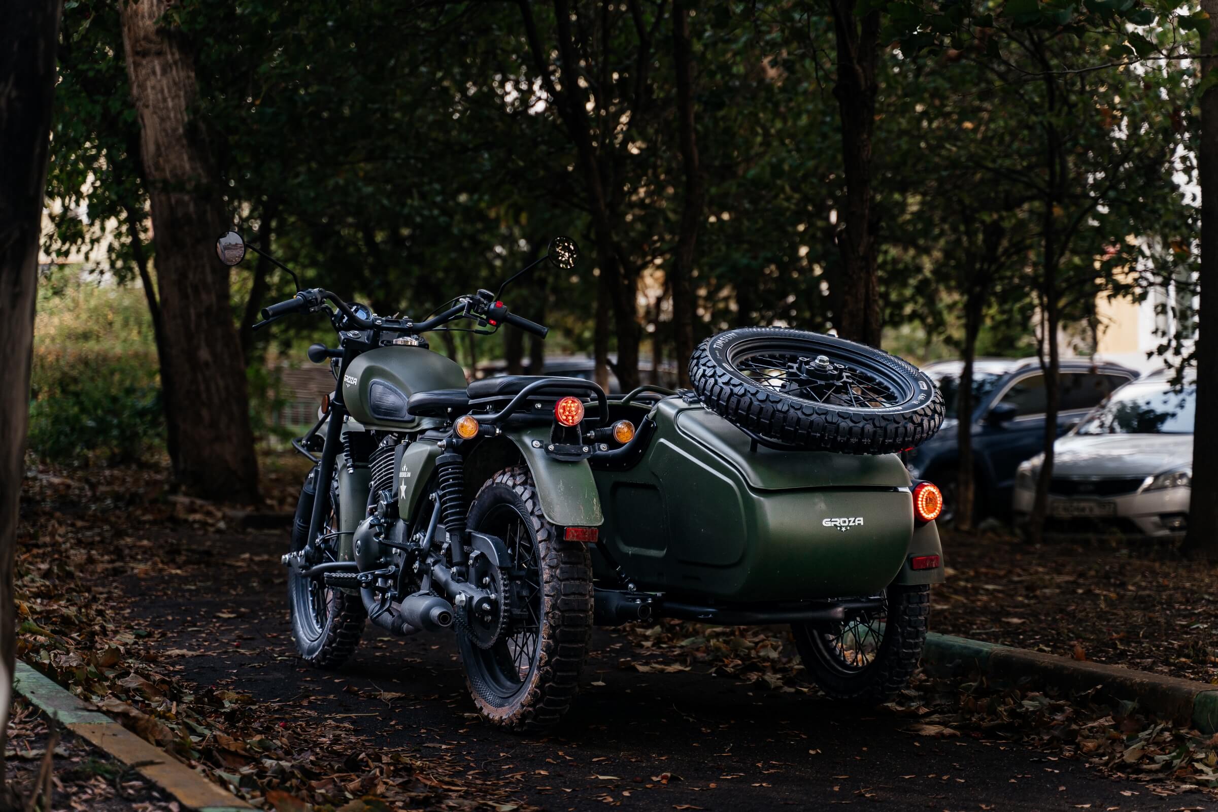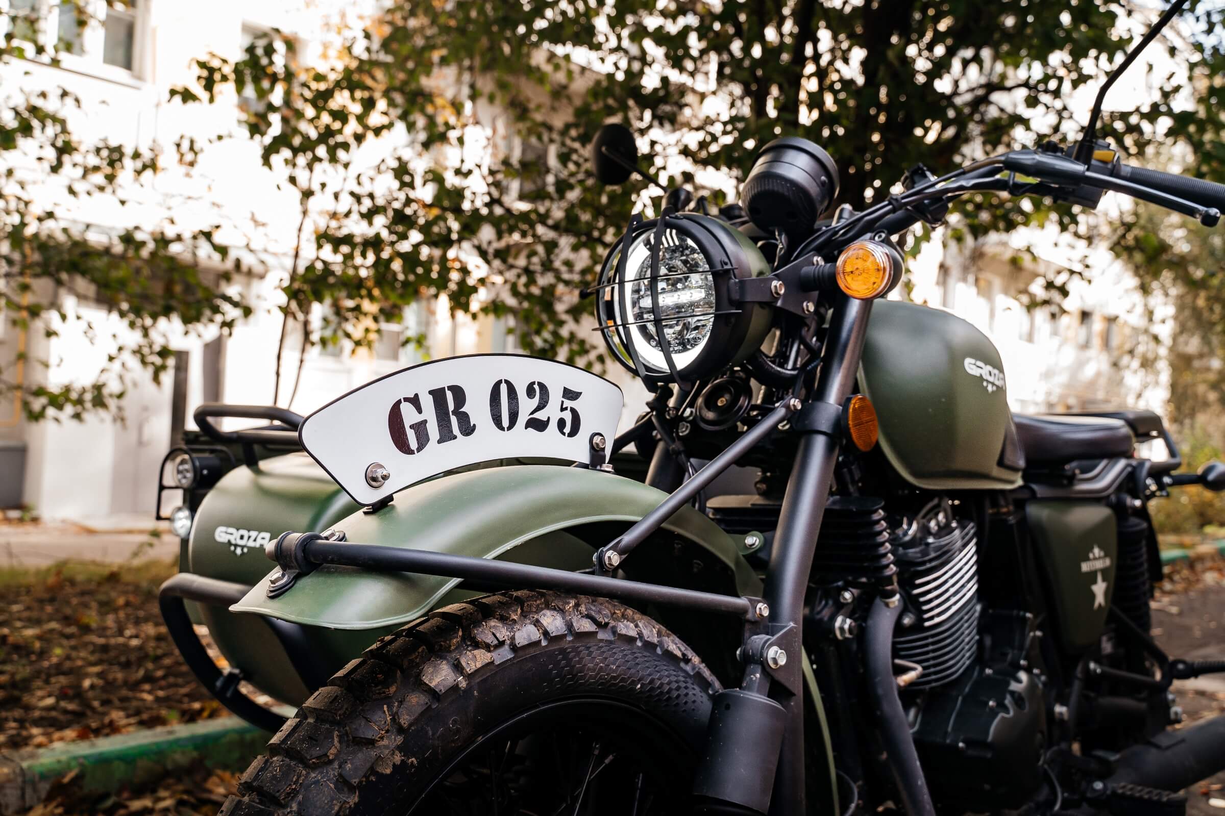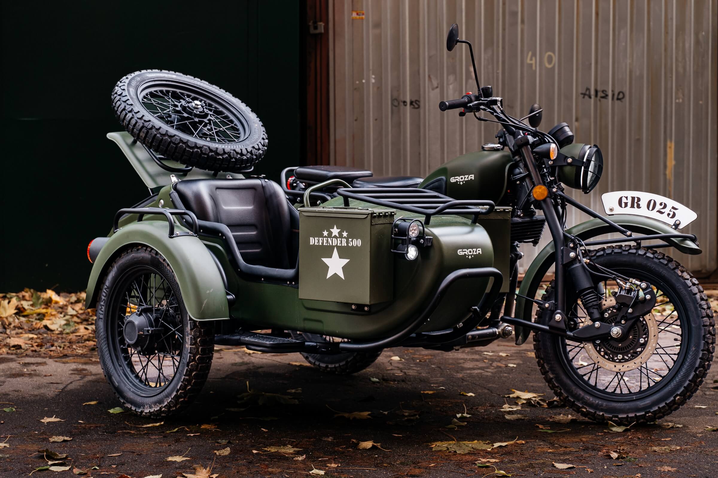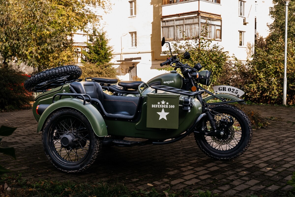 GROZA Defender 500 – мотоцикл с коляской в расцветке милитари с изящными олдскульными фонарями и выносливым двигателем. На внешнем виде отголоски прошлого заканчиваются, так как модель имеет современное техническое оснащение.