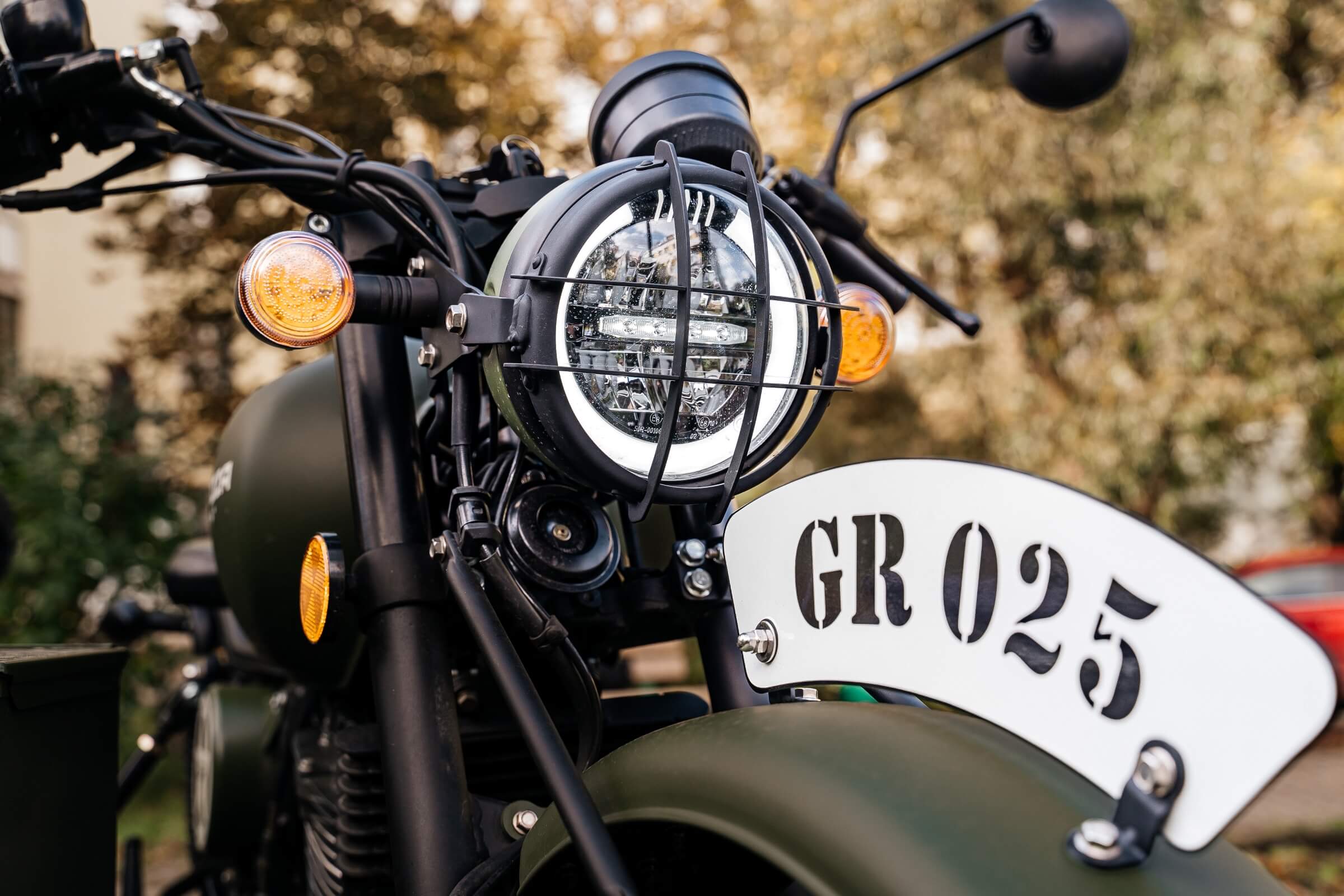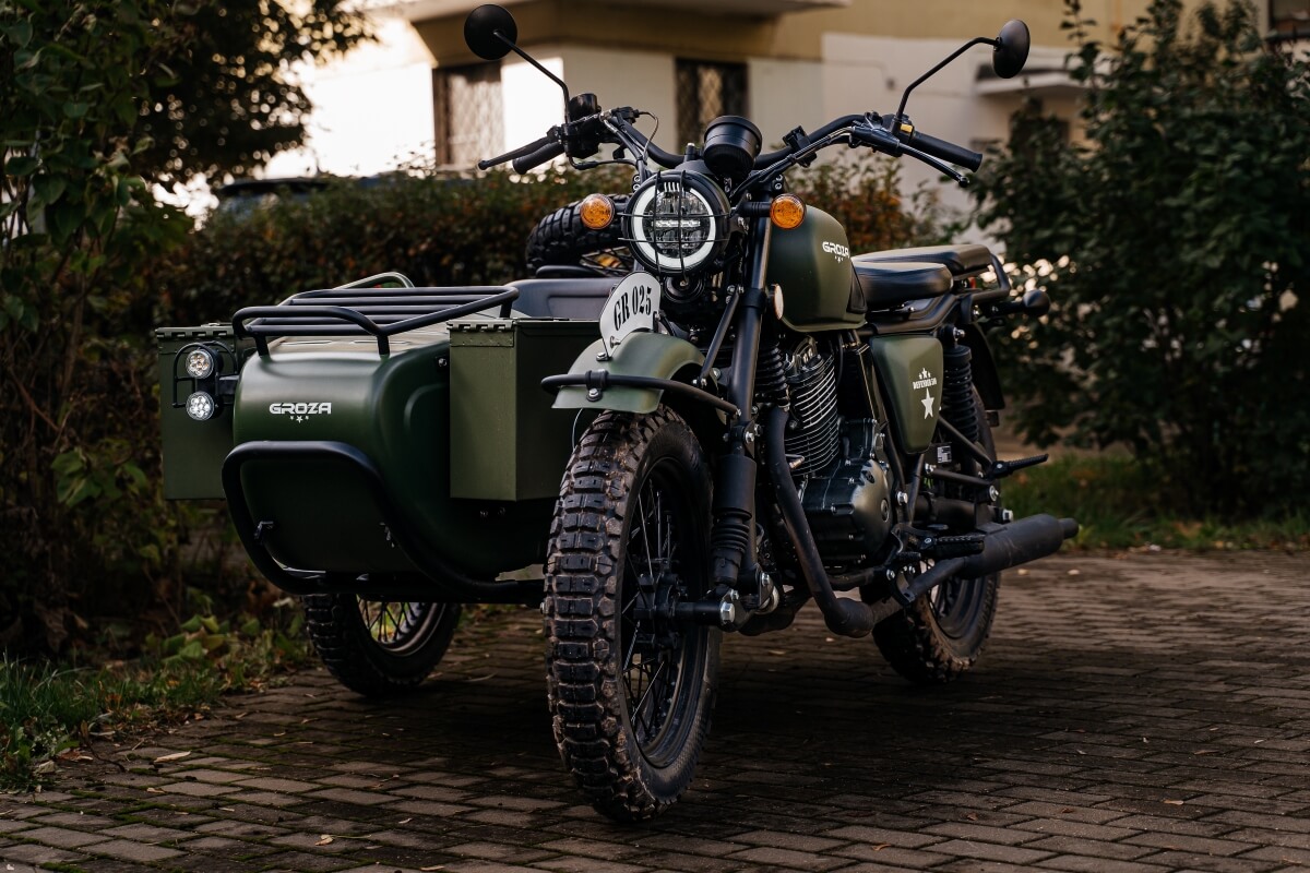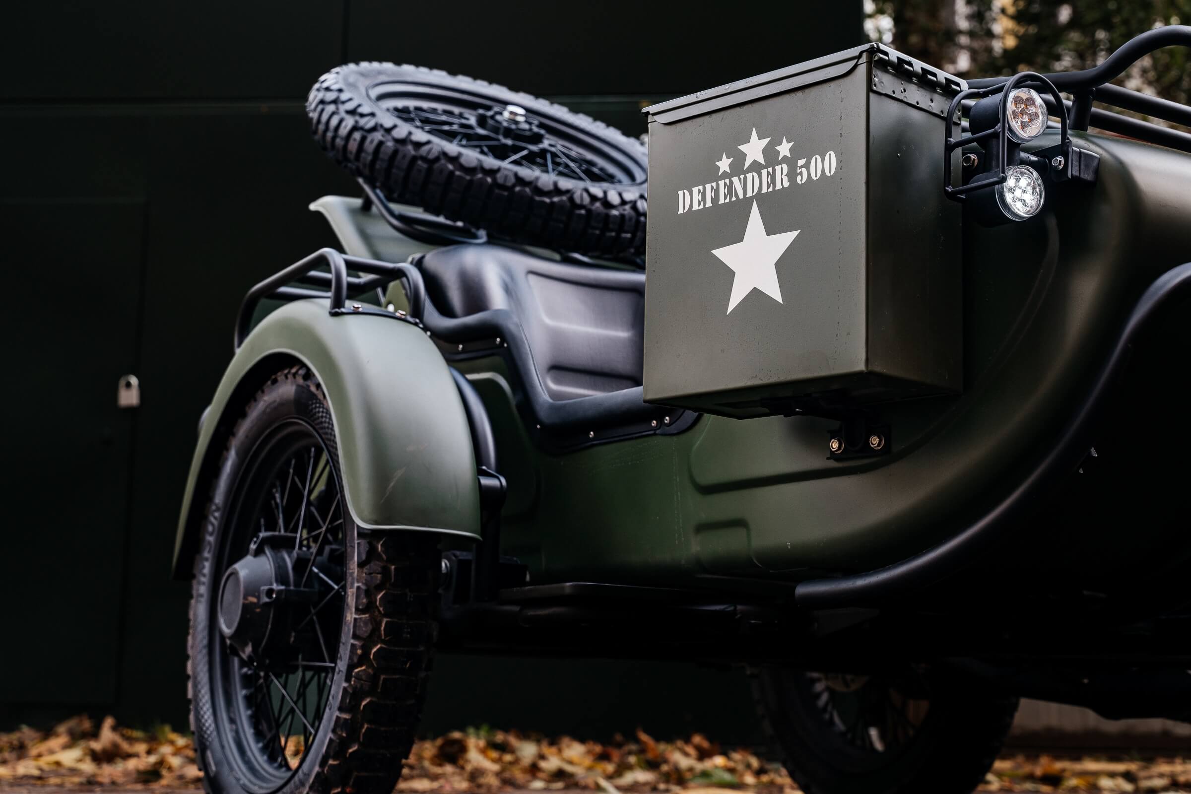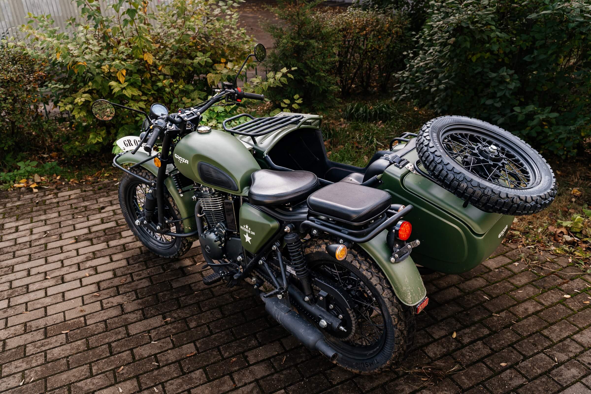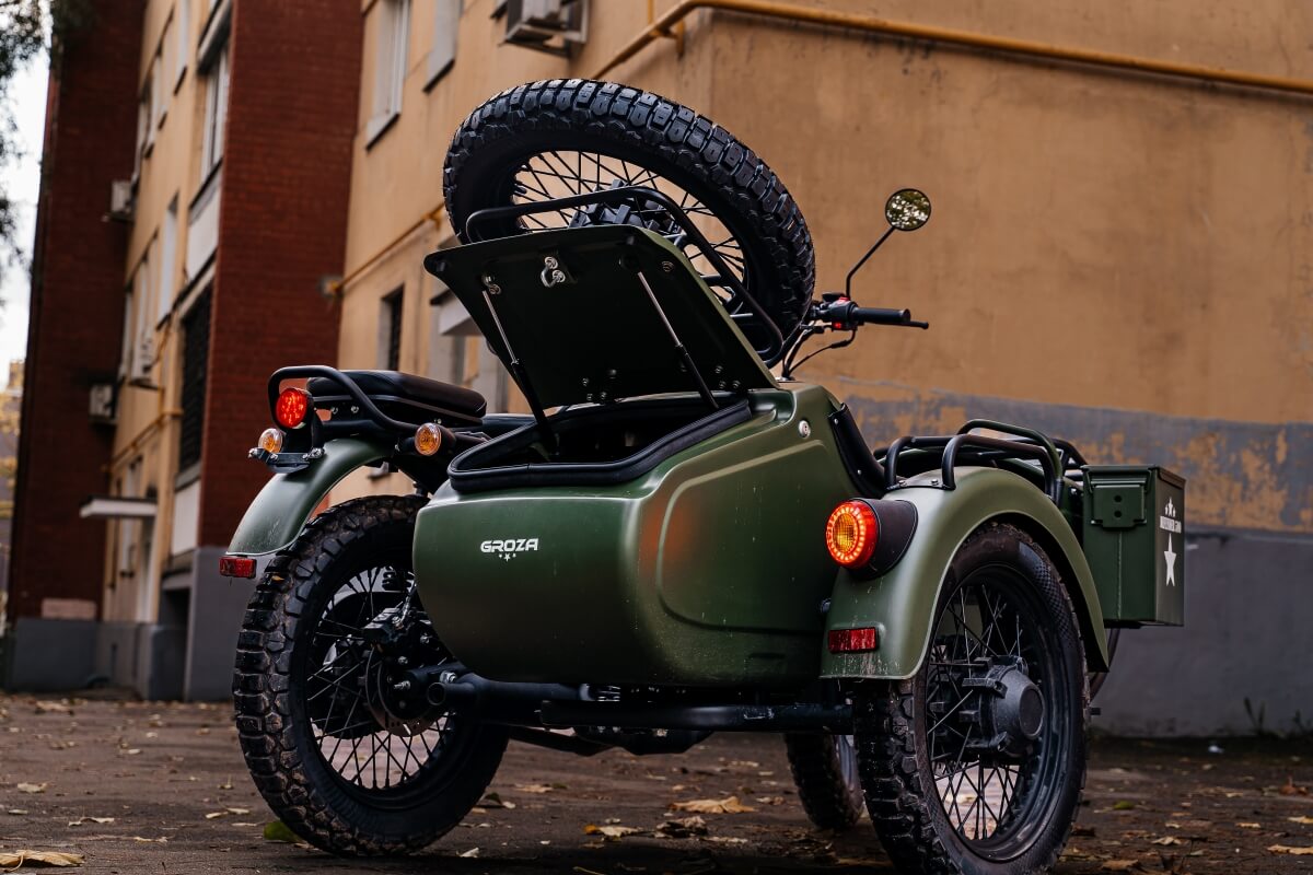 GROZA Defender 500 – мотоцикл с коляской в расцветке милитари с изящными олдскульными фонарями и выносливым двигателем. На внешнем виде отголоски прошлого заканчиваются, так как модель имеет современное техническое оснащение.