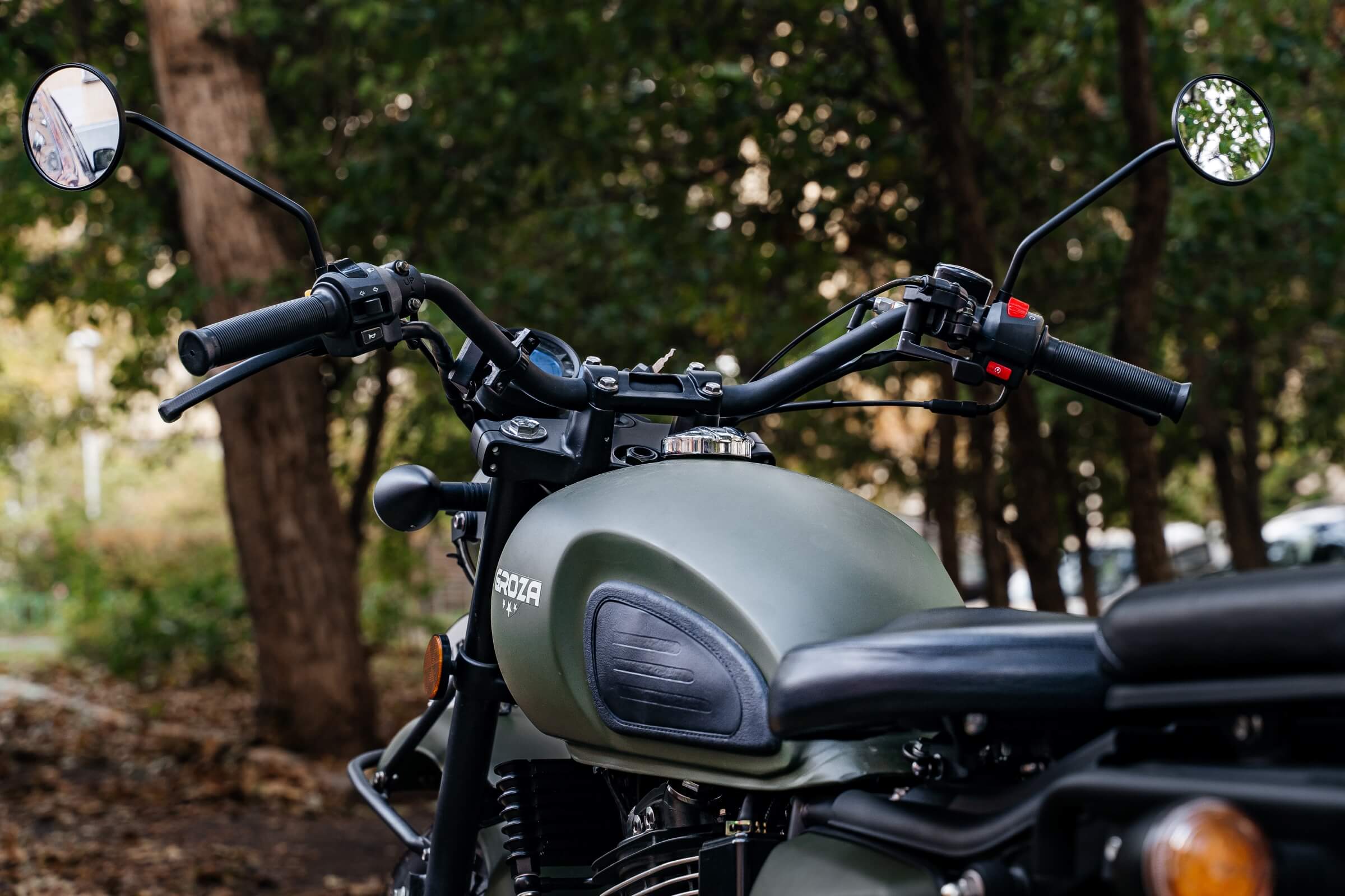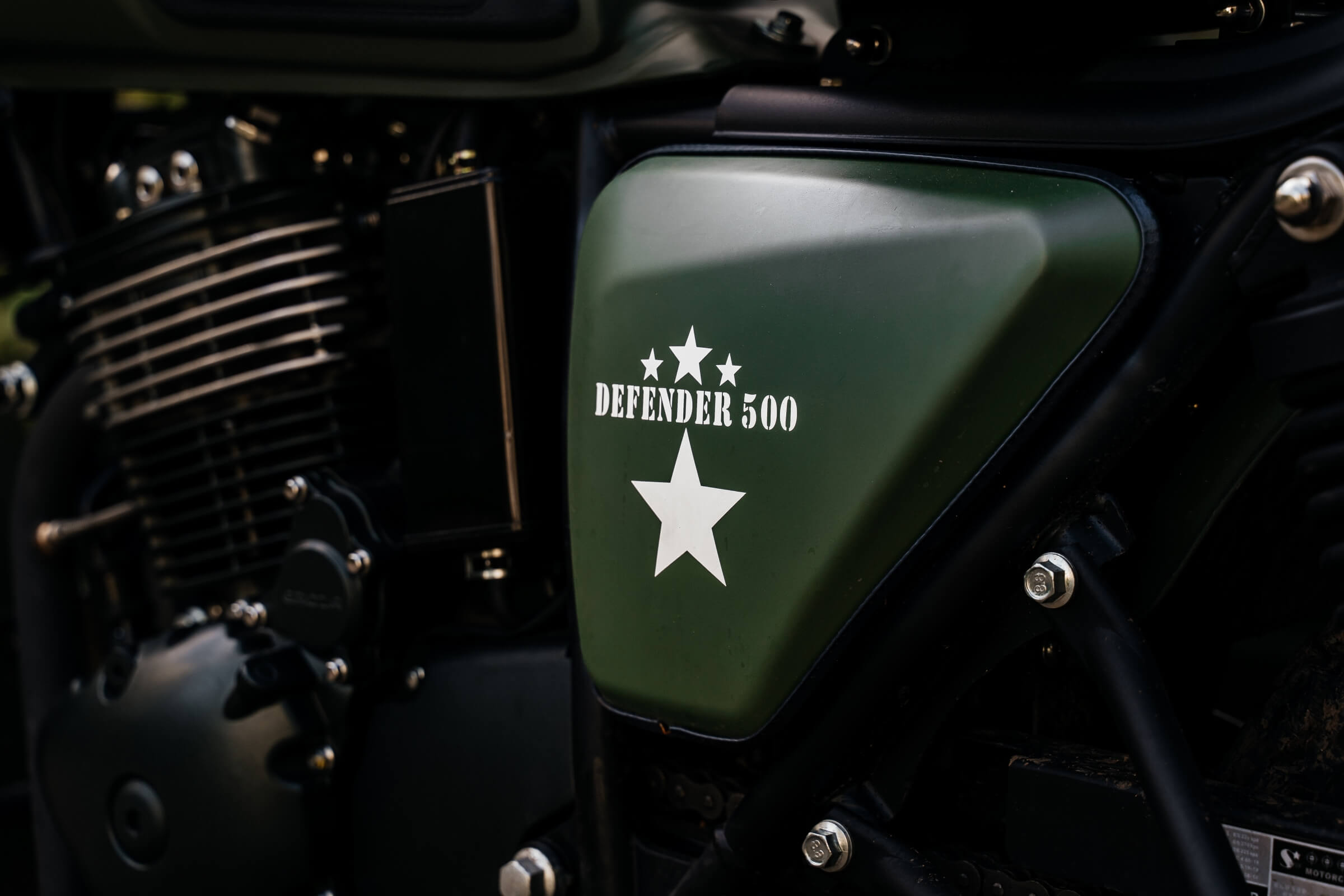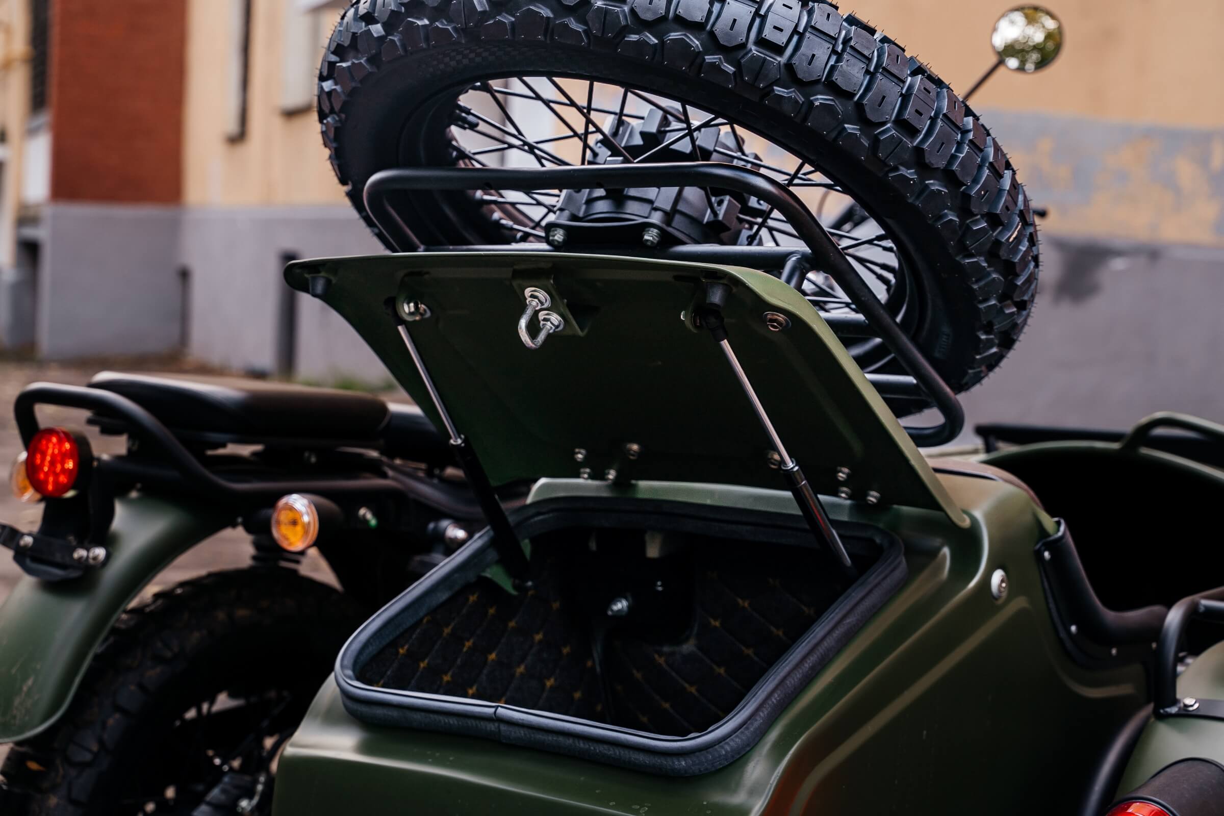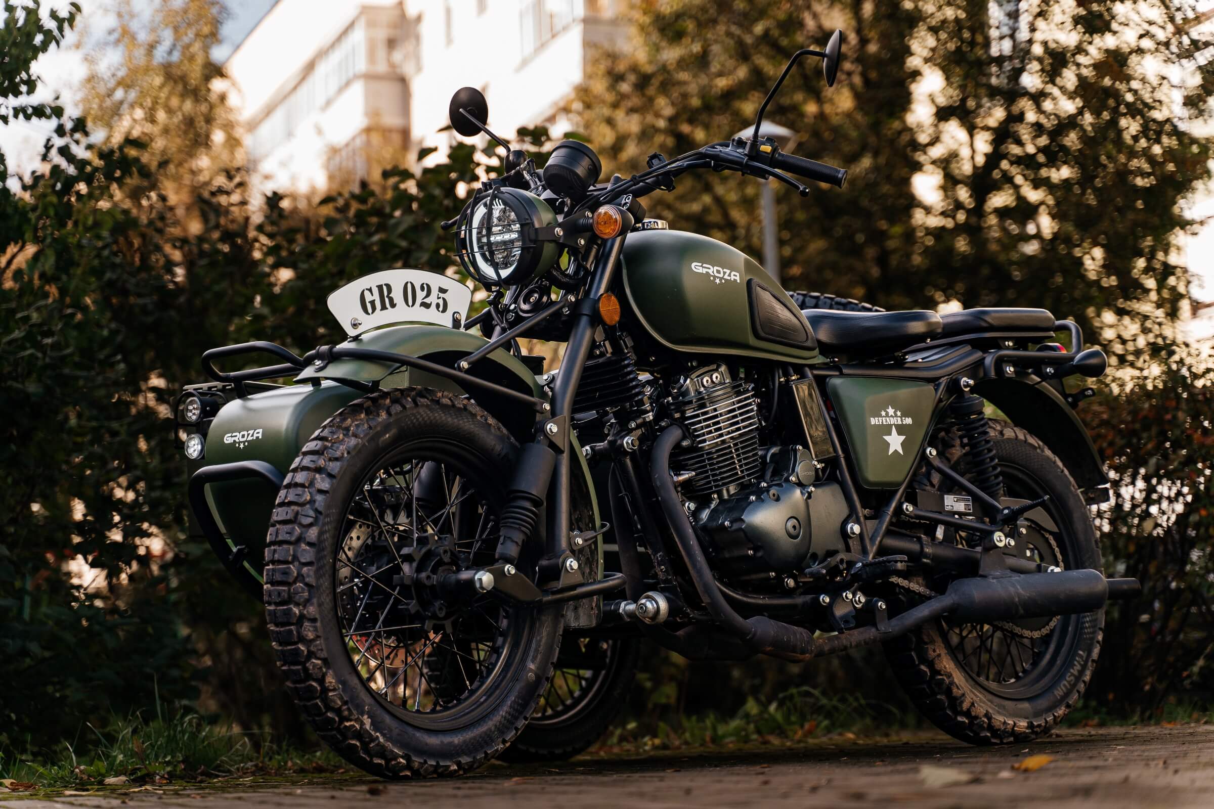 GROZA Defender 500 – мотоцикл с коляской в расцветке милитари с изящными олдскульными фонарями и выносливым двигателем. На внешнем виде отголоски прошлого заканчиваются, так как модель имеет современное техническое оснащение.