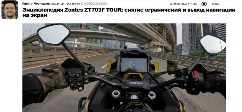 Редактор и тест-пилот издания «Мотогонки.ру» Кирилл Чернышев завершил боевое крещение ZONTES ZT703-F TOUR. За 4 дня мотоцикл прошёл 1000-километровую обкатку по маршруту Москва – Тверь – скоростная трасса М11.