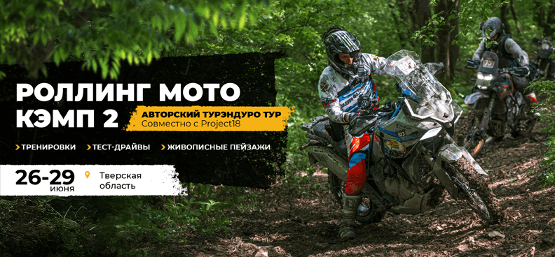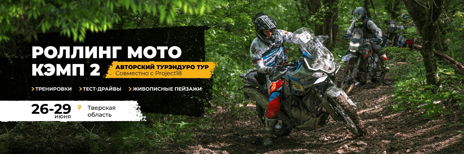 Кэмп пройдет в сотрудничестве с Project18. С 26 по 29 июня участников ждёт трехдневный турэндуро тренинг в живописной Тверской области. Тренировки будут проходить на стадионе, подготовленном для фестиваля Project18 ADV FEST. На стадионе гонщиков ждёт 15 различных препятствий, кросс-кантри трек и около 100 км трассы по бездорожью вокруг. Участники получат возможность испытать то, что испытали райдеры Project18 ADV FEST 2023!