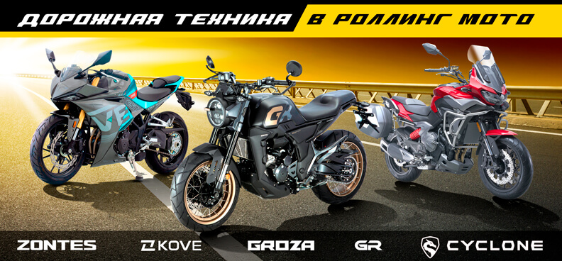 Приглашаем вас присоединиться к захватывающему путешествию с новой коллекцией дорожной мототехники Cyclone, Groza и Zontes. Выберите свой идеальный байк - отправляйтесь на поиск приключений или просто сделайте свои ежедневные поездки приятными и удобными. Все это возможно вместе с нами - увидимся в Роллинг Мото!