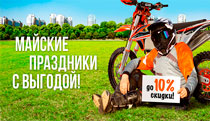 С 30 апреля по 10 мая в сети мотосалонов и нашем интернет-магазине всех наших покупателей ждут отличные майские цены на весь ассортимент экипировки, запчастей и аксессуаров, которые вы можете приобрести со скидкой в 10%!