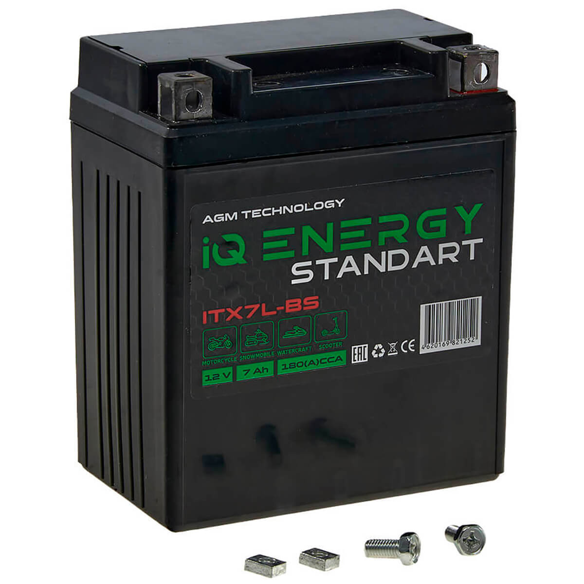 Аккумулятор IQ ENERGY Moto 7Ah (CT1207.1) ITX7L-BS – cвинцово-кислотный аккумулятор, работающий под напряжением 12 В, имеющий прямую полярность (- +) и ёмкость 7 А/ч. Подходит для мотоциклов, снегоходов, гидроциклов, электросамокатов. Технология AGM подразумевает, что весь электролит находится в связанном состоянии – впитан в стекловолоконную матрицу – и нигде более, за исключением пространства между пластинами, в объёме аккумулятора не присутствует.