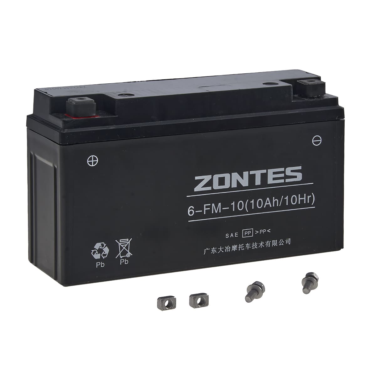 Аккумулятор ZONTES ZT (6-FM-10-10Ah) – cвинцово-кислотный аккумулятор, работающий под напряжением 12 В, имеющий прямую полярность (- +) и ёмкость 10 А/ч. Предназначен для мотоциклов ZONTES. Размер 114х61х196 мм.