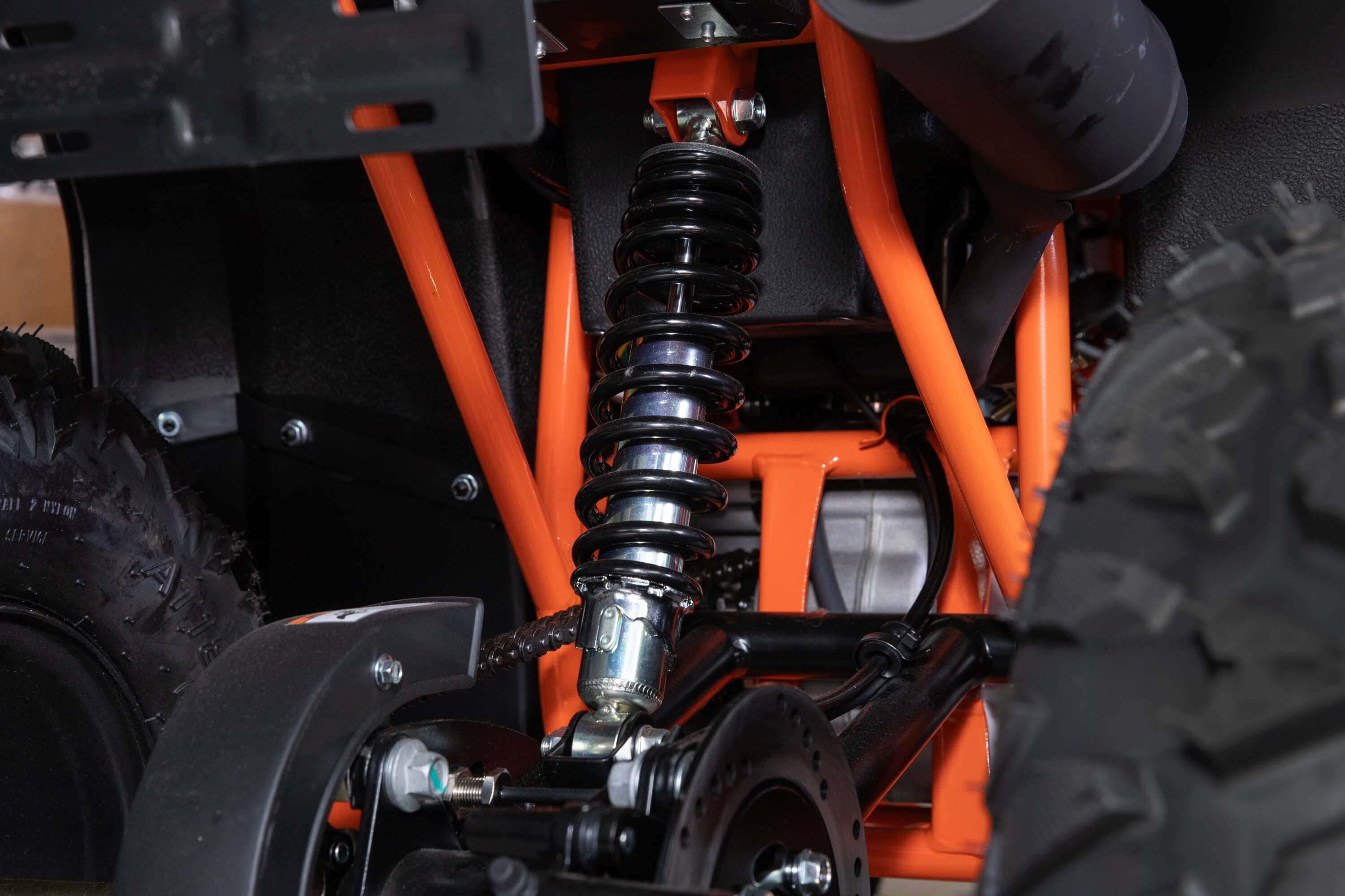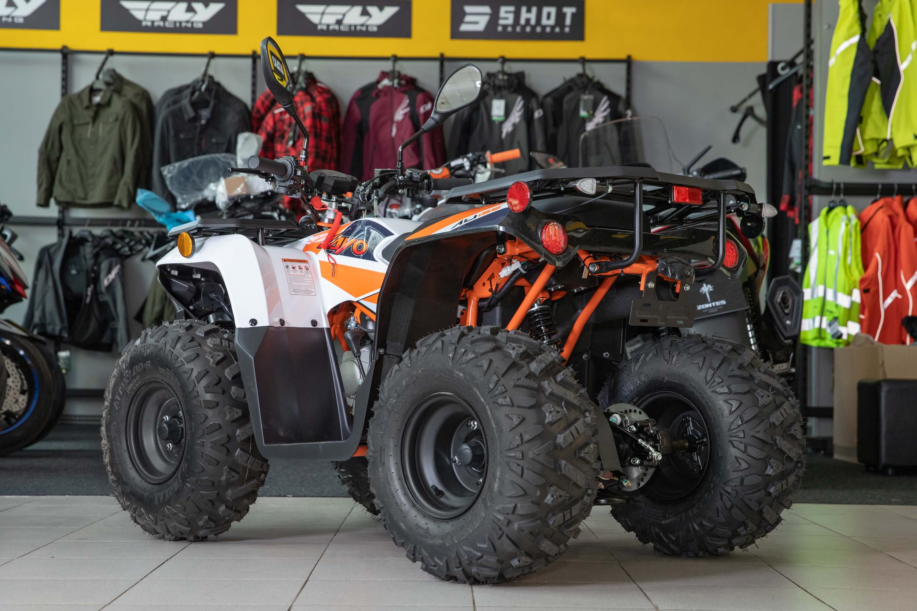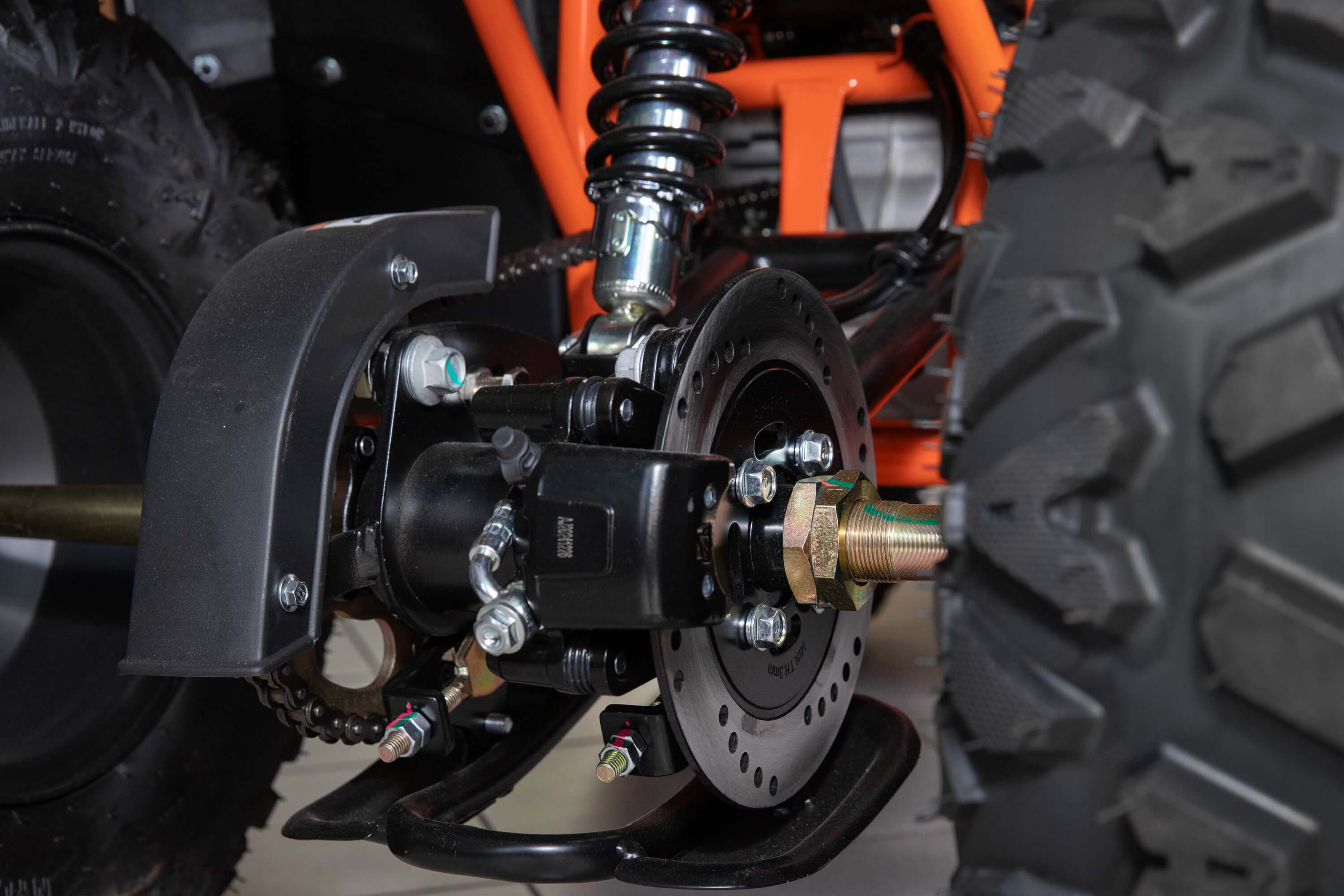 Диаметр колёс 8 дюймов. Подвеска спереди и сзади представлена амортизаторами длиной 265 мм. За торможение отвечает дисковая гидравлическая система.