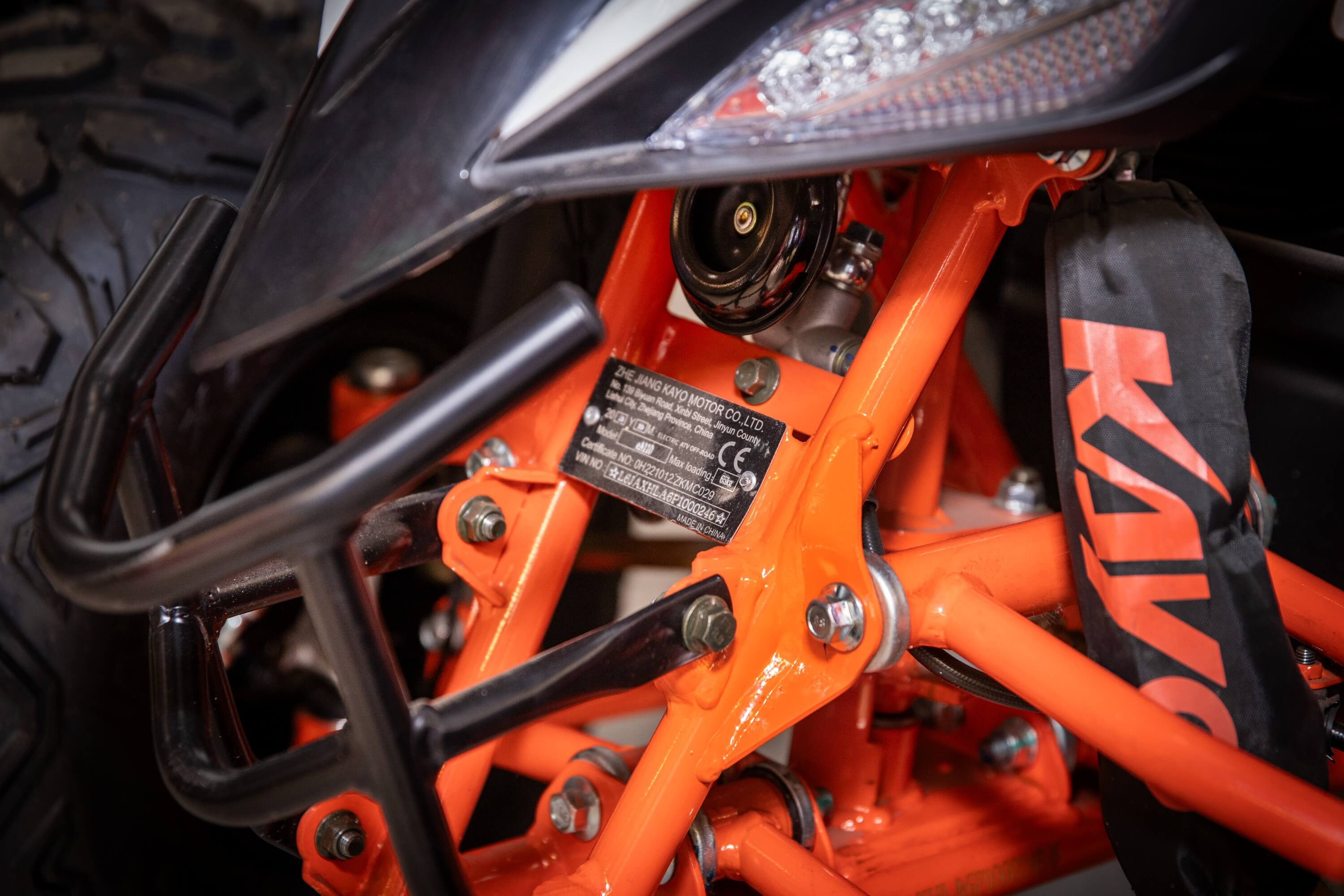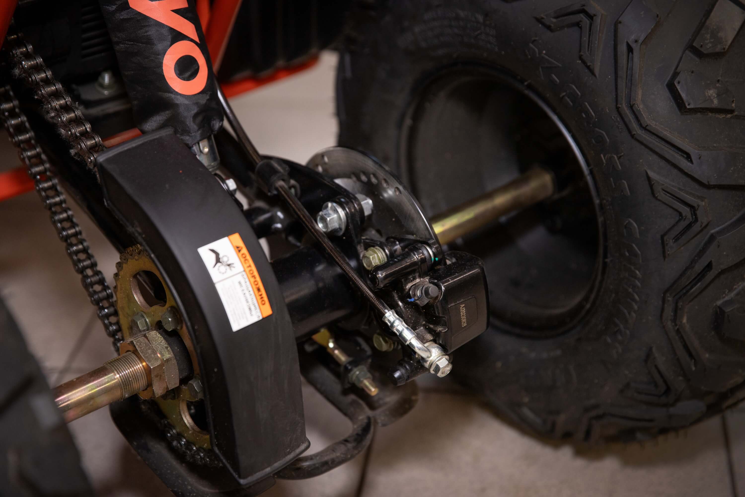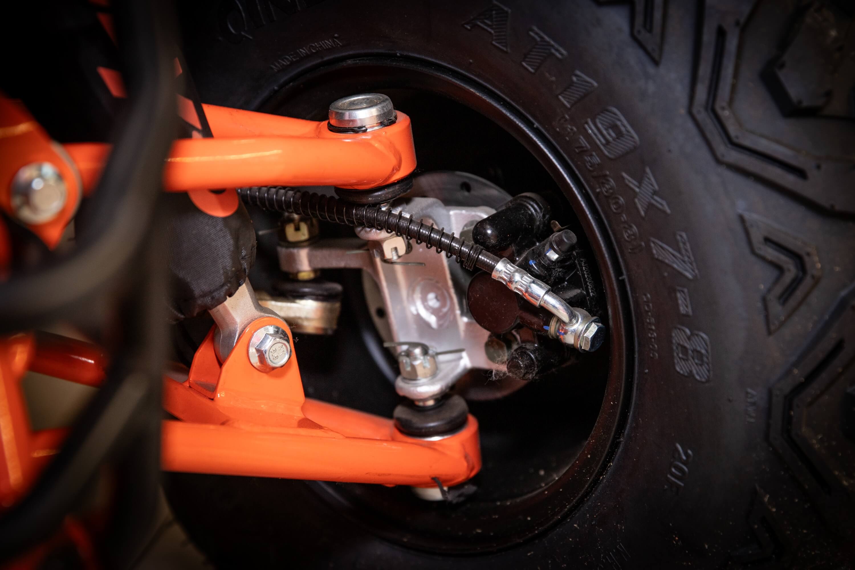 Диаметр колёс 8 дюймов. Подвеска спереди и сзади представлена амортизаторами длиной 265 мм. Задний амортизатор можно отрегулировать. На обеих осях установлены дисковые гидравлические тормоза.