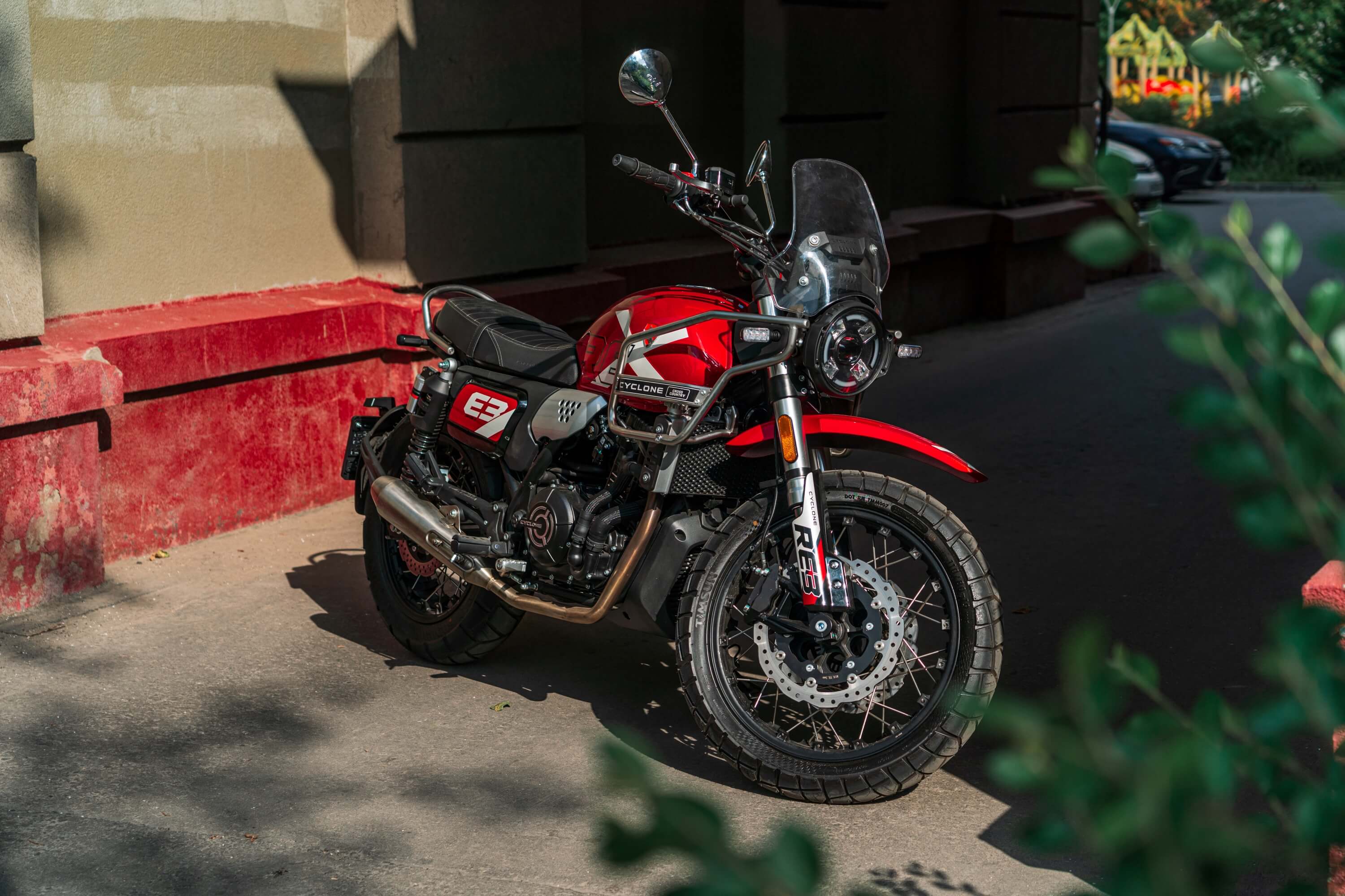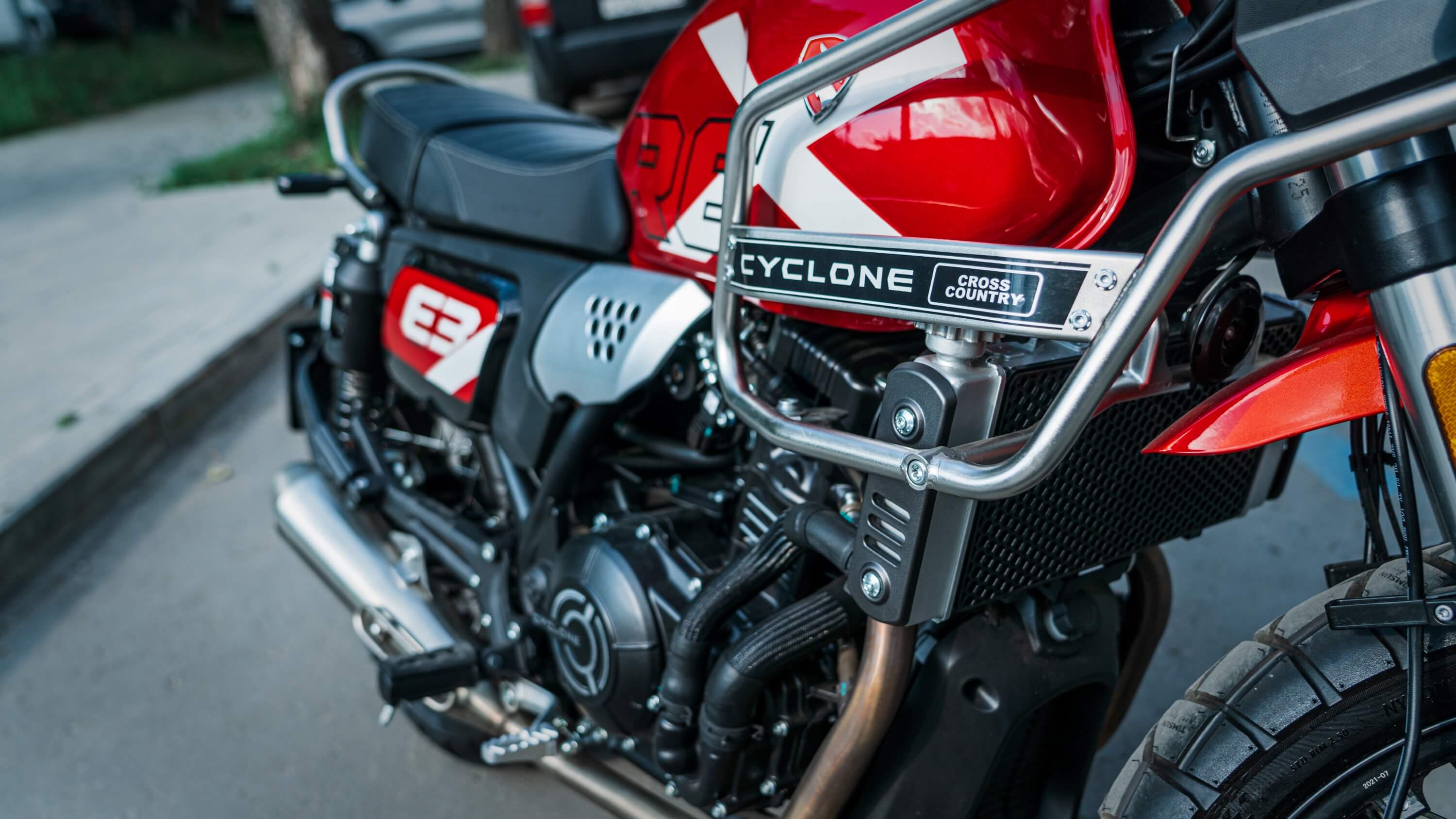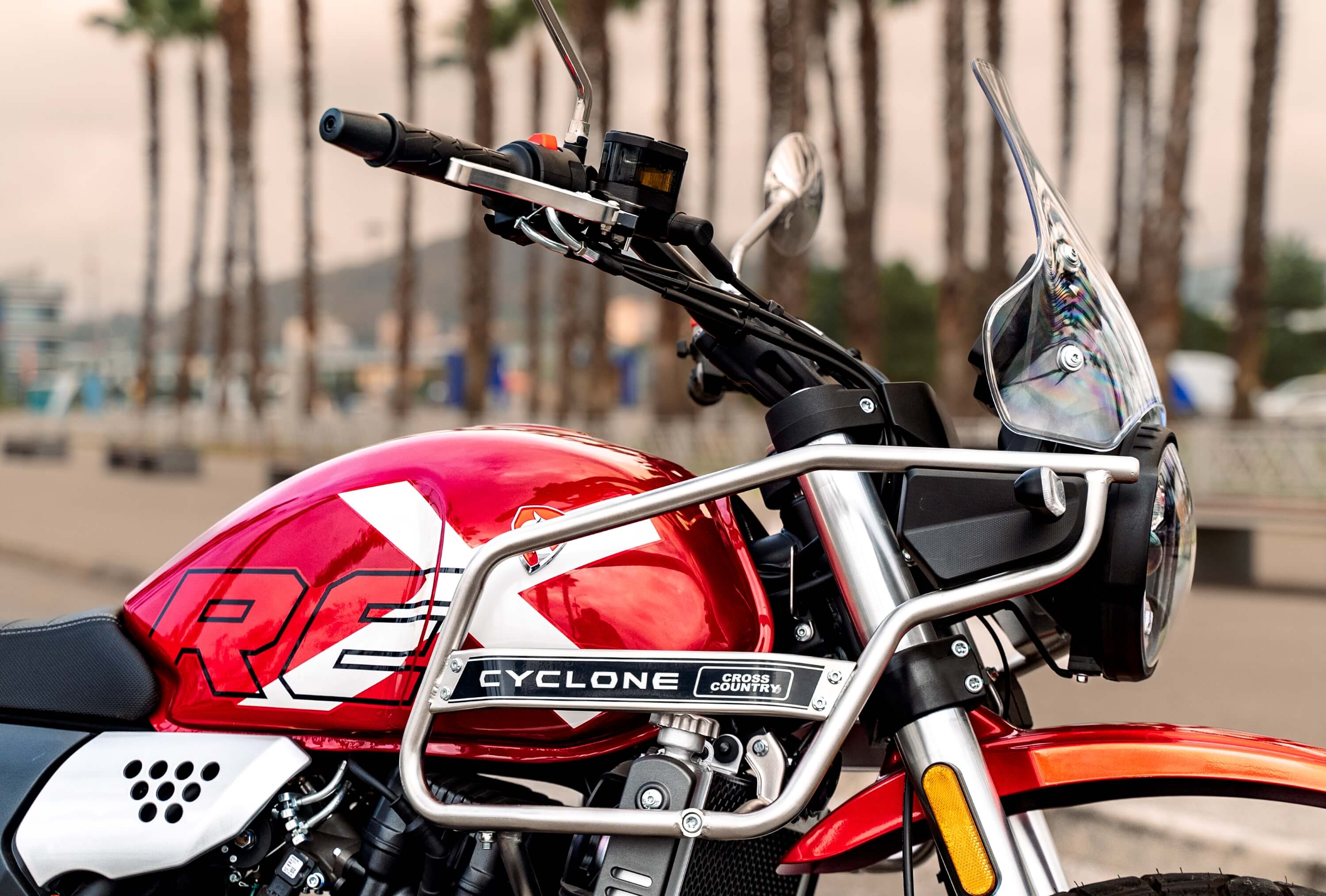 Мотоцикл CYCLONE RE3 Scrambler (SR400-A) – универсальный городской мотоцикл с внедорожными чертами, выполненный в каферейсерской стилистике. Управляя им, можно бросить вызов и городским пробкам, и скоростным автострадам, и всевозможному лёгкому бездорожью.