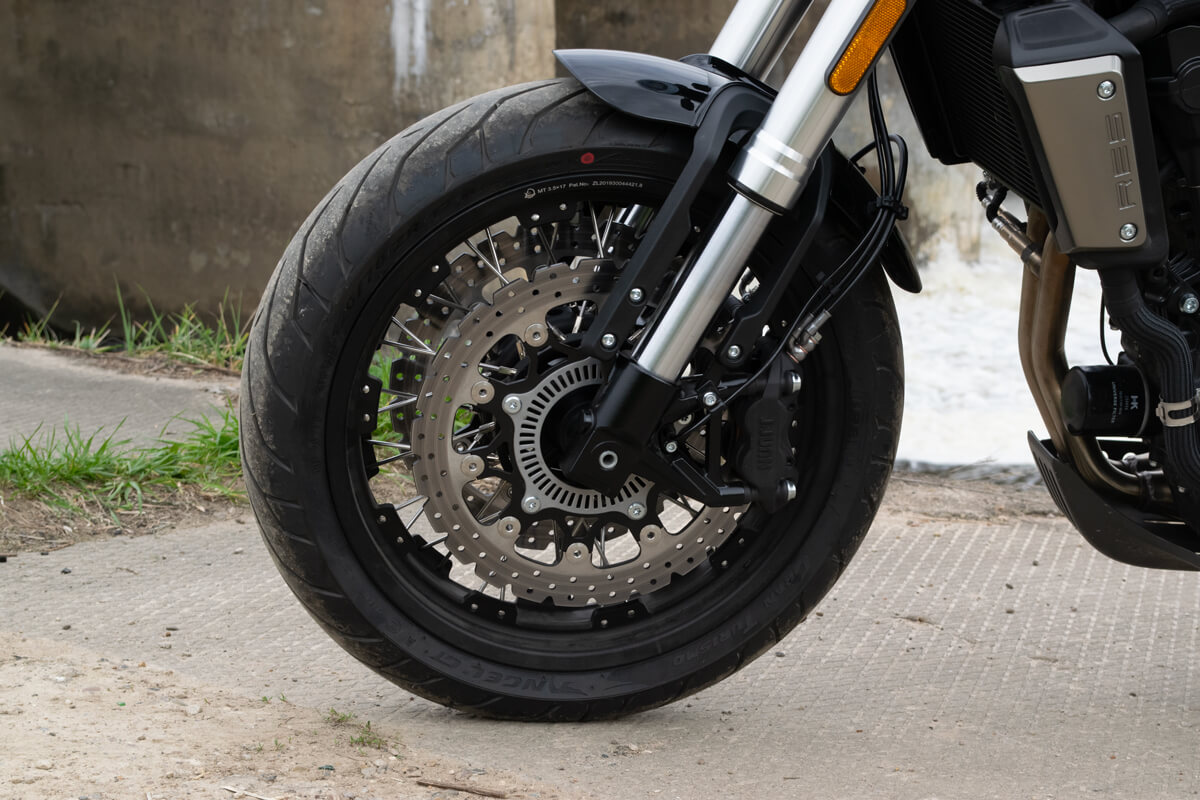 RE5 оснащён спицованными колёсами диаметром 17 дюймов, обутыми в бескамерные покрышки. С неровностями дороги эффективно справляются телескопическая вилка перевёрнутого типа спереди и маятник с моноамортизатором сзади. Ход передней подвески составляет 120 мм, задней – 50 мм. Оба компонента подвески являются регулируемыми. Эффективное и безопасное замедление с любых скоростей обеспечивают гидравлические дисковые тормоза с ABS спереди и сзади. Тормозные системы произведены известной испанской фирмой J.JUAN, входящей в холдинг BREMBO.