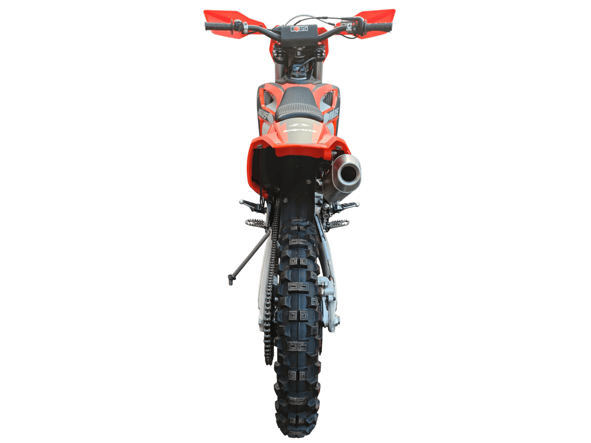 Мотоцикл собран на хроммолибденовой раме с маятником из алюминия. Пластик гибкий и устойчивый к нагрузкам. Имеются подножки для водителя и для пассажира. При габаритах 2150х840х1260 мм вес мотоцикла составляет 125 кг. Сиденье имеет классическую для внедорожной техники форму и мягкое антискользящее покрытие. Высота по седлу 950 мм – подходит даже для высоких райдеров.