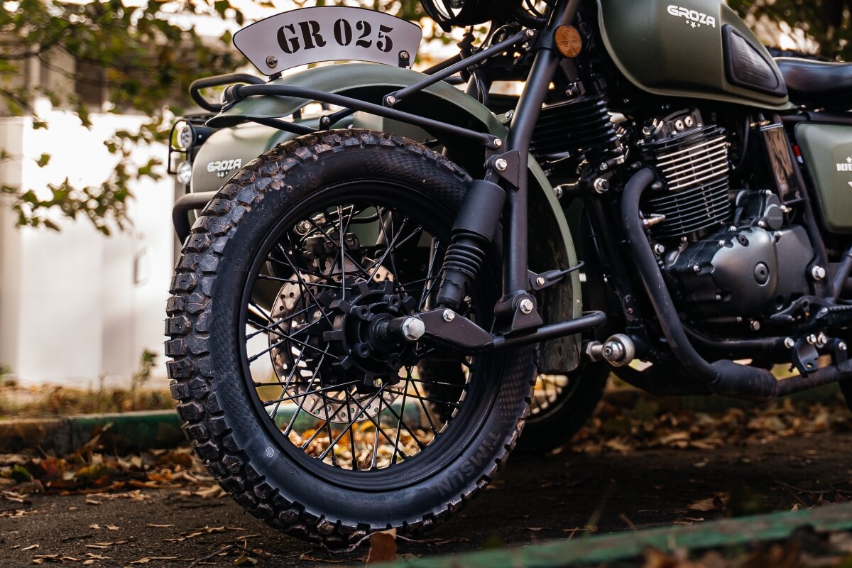 GROZA Defender 500 – мотоцикл с коляской в расцветке милитари с изящными олдскульными фонарями и выносливым двигателем. На внешнем виде отголоски прошлого заканчиваются, так как модель имеет современное техническое оснащение.