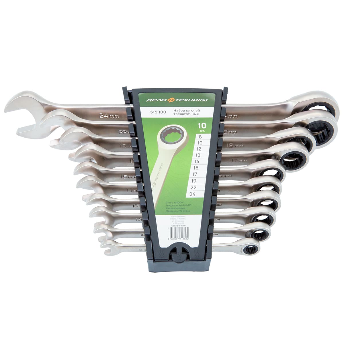 Набор ключей комбинированных трещоточных 10 шт с пластиковым холдером – универсальный набор для широкого спектра работ. Выполнен из качественных материалов и обладает высокой износостойкостью. Размеры ключей: 8, 10, 12, 13, 14, 15, 17, 19, 22, 24 мм.