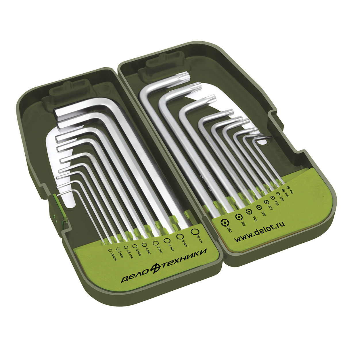 Набор ключей шестигранные + TORX – универсальный набор для широкого спектра работ. Выполнен из качественных материалов и обладает высокой износостойкостью. Размеры шестигранных ключей: 1,5; 2; 2,5; 3; 4; 5; 6; 8; 10 мм. Размеры ключей TORX: T10, T15, T20, T25, T27, T30, T40, T45, T50.