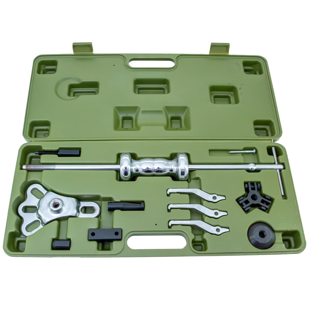 Набор съёмников с обратным молотком предназначен для снятия полуоси, ступицы, барабанов, подшипников, шестерней и втулок. Инструменты находятся в удобном пластиковом кейсе. В наборе 16 предметов.