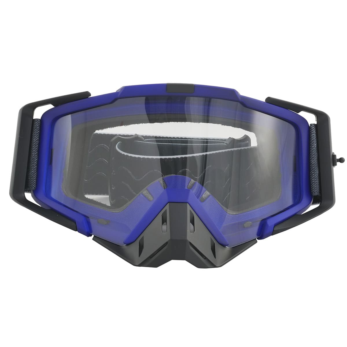 Прочная рама не только защищает глаза, но и устойчива к ударам и вибрациям. Резинка шириной 48 мм с силиконовым напылением надёжно удерживает очки на шлеме. Развитая система вентиляции предотвращает запотевание линз и обеспечивает комфортную носку даже во время интенсивной езды. Уплотнитель обеспечивает эффективный отвод влаги и идеальную посадку очков на лицо. Корпус очков адаптирован ко всем типам форм и размеров мотошлемов.