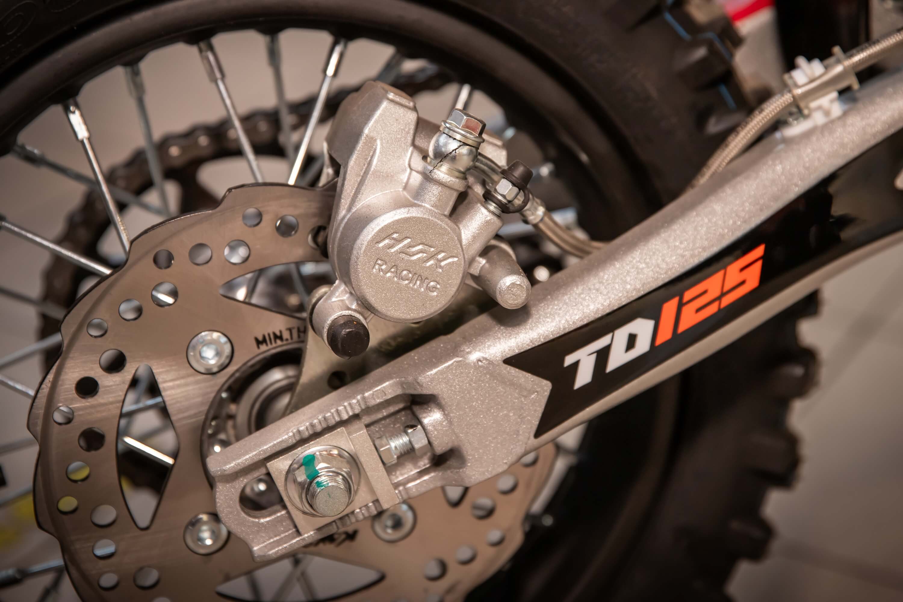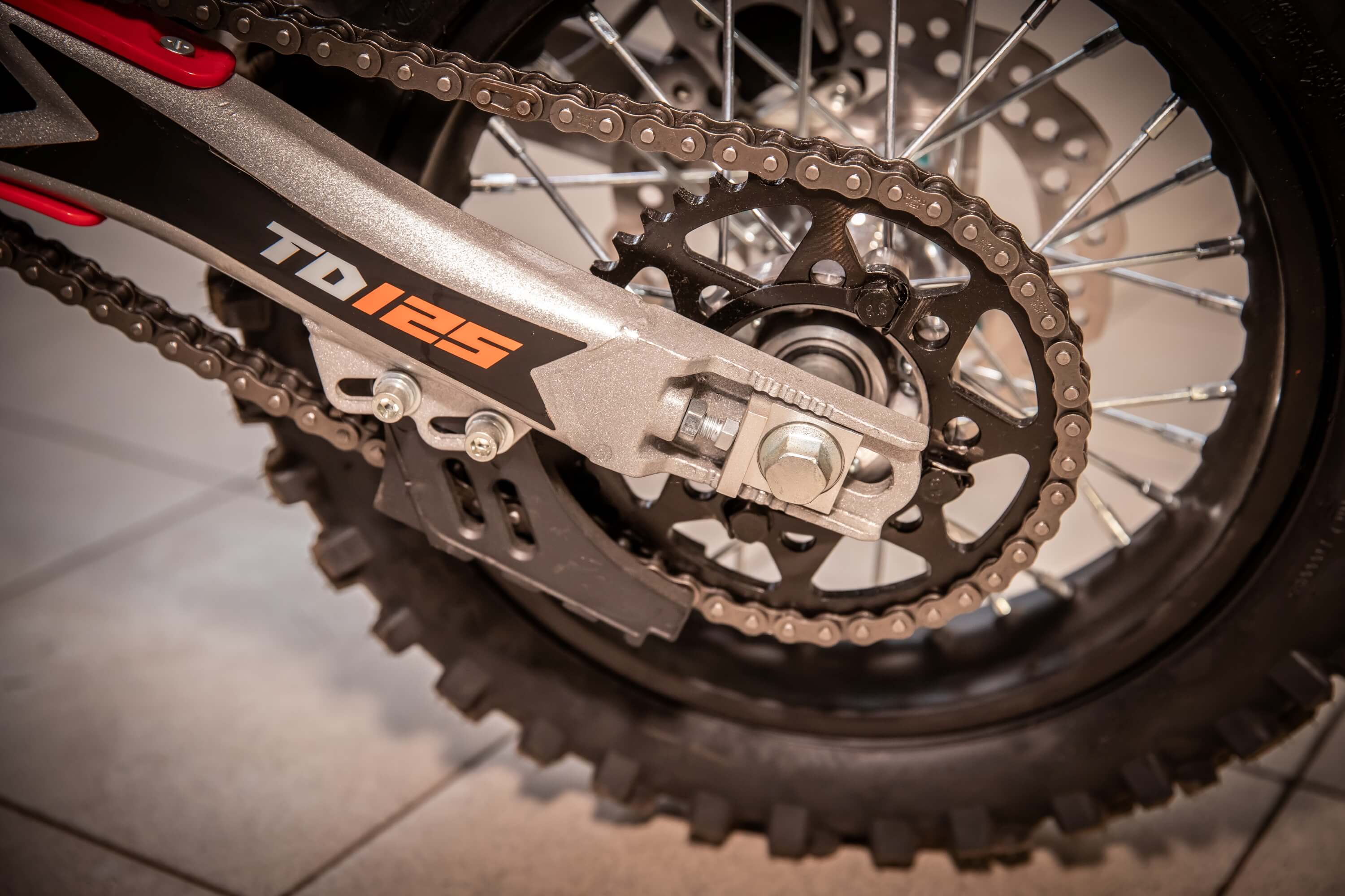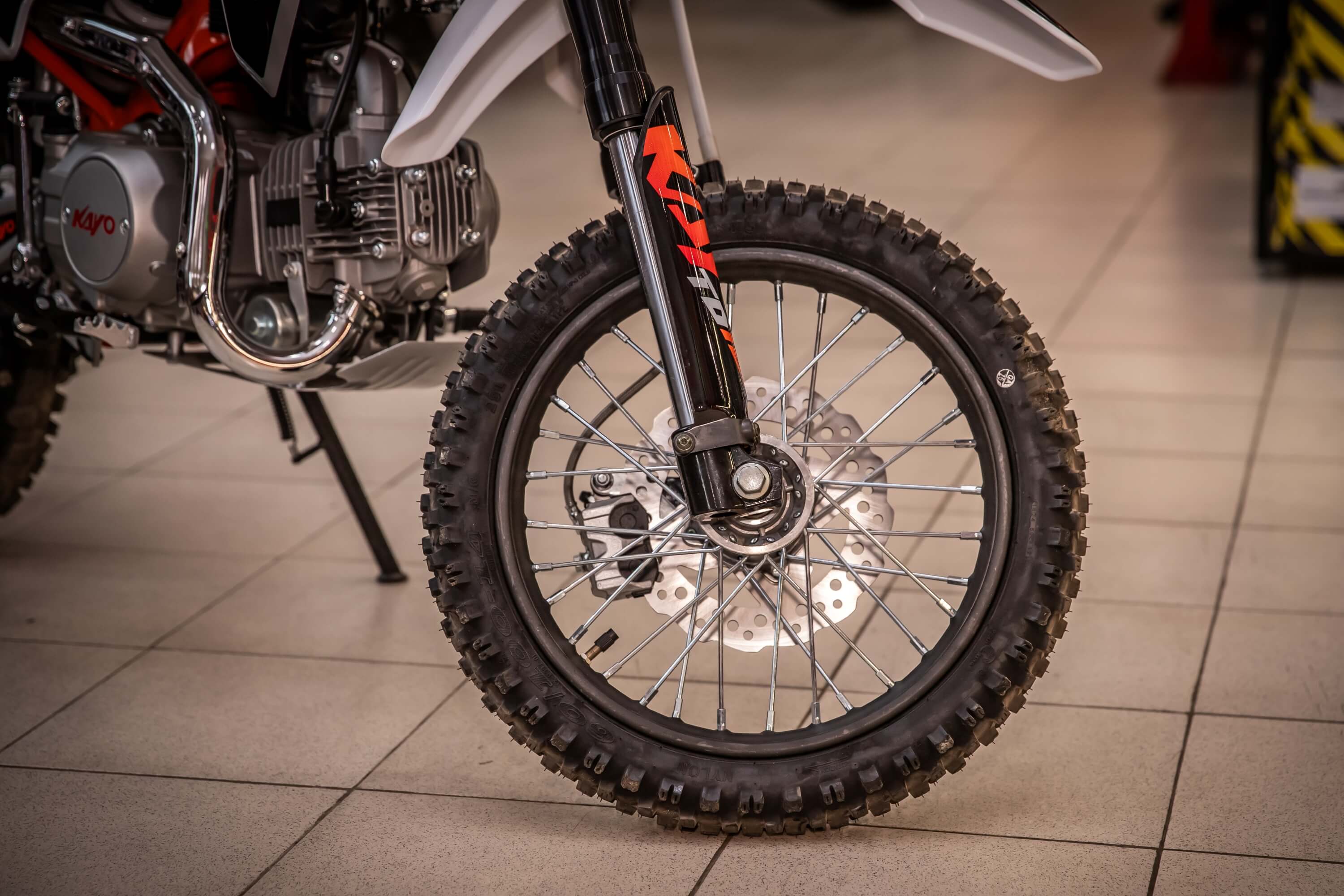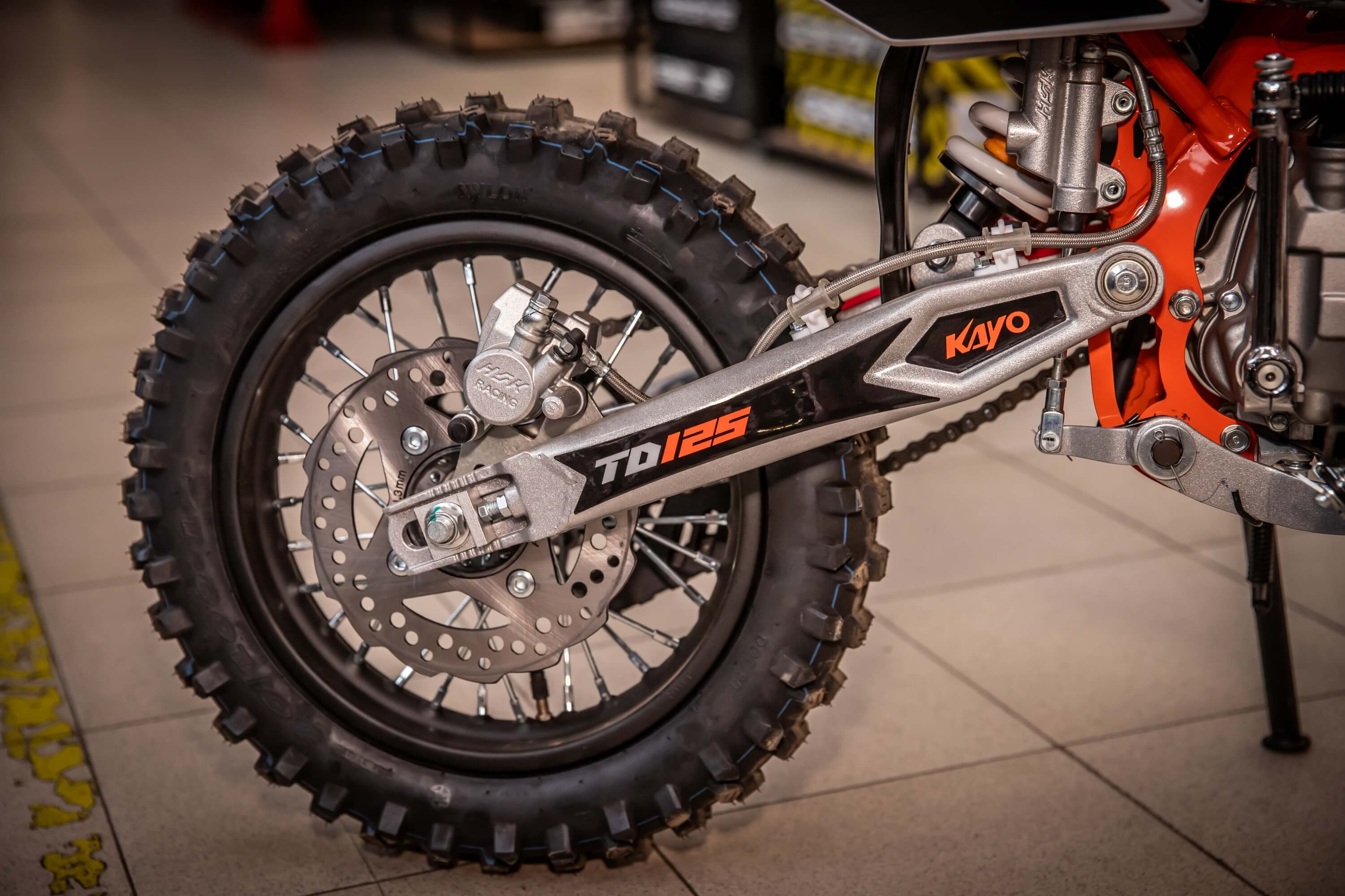 Питбайк KAYO Mini TD125 14/12 – подходящий вариант для смелых ребят от 8 лет. С ним можно научиться основам и контролю скорости на крутых спусках или сыпучих грунтах.