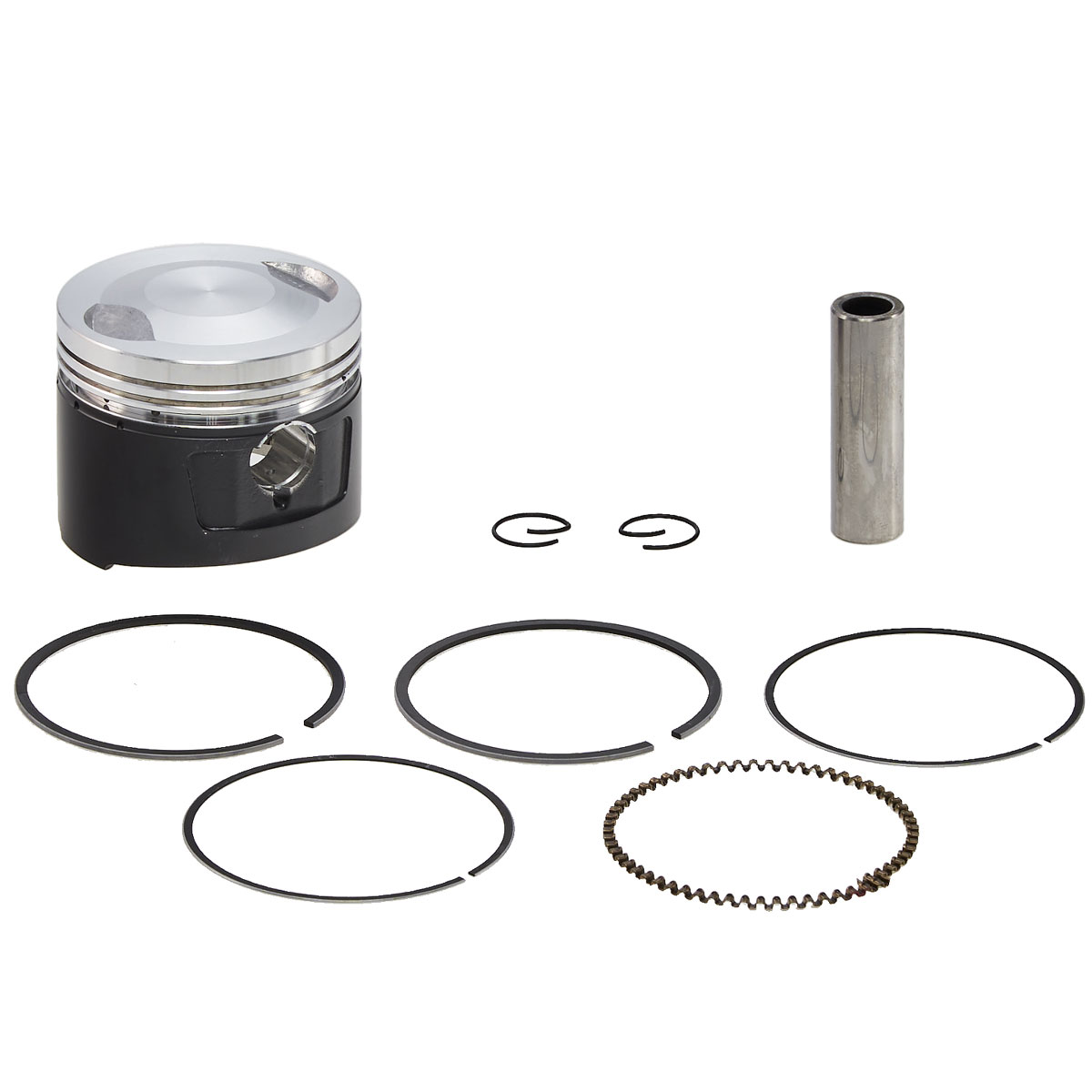 В комплекте: поршень, поршневой палец, набор колец для поршня, 2 стопорных кольца.