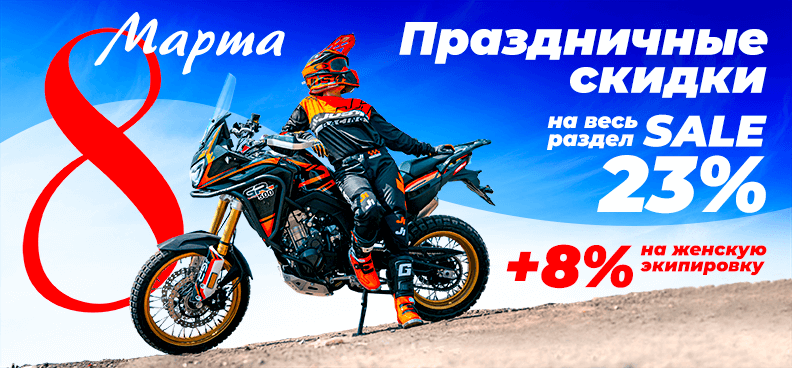 Отличная новость для всех прекрасных мотоледи: 8 марта вас ждёт скидка 23% на весь раздел Sale, а на всю женскую экипировку – небывалая скидка 23%+8%!