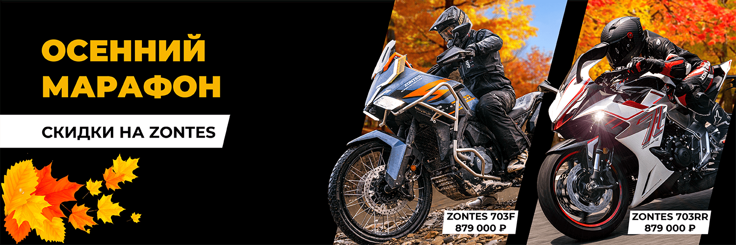 Мы снижаем цены на мотоциклы и максискутеры для бездорожья, трассы и города, не обходя стороной и нашумевшие модели – туристический эндуро ZONTES 703-F и спортивный мотоцикл ZONTES 703-RR! Также в акции участвует множество комфортных городских моделей с двигателями 350 и 368 см³.