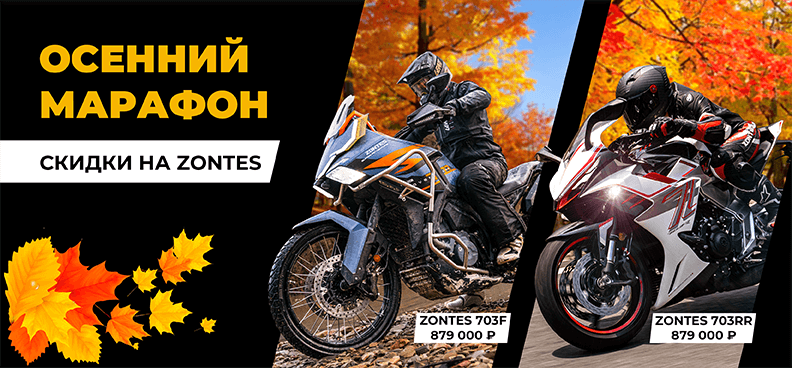 Мы снижаем цены на мотоциклы и максискутеры для бездорожья, трассы и города, не обходя стороной и нашумевшие модели – туристический эндуро ZONTES 703-F и спортивный мотоцикл ZONTES 703-RR! Также в акции участвует множество комфортных городских моделей с двигателями 350 и 368 см³.