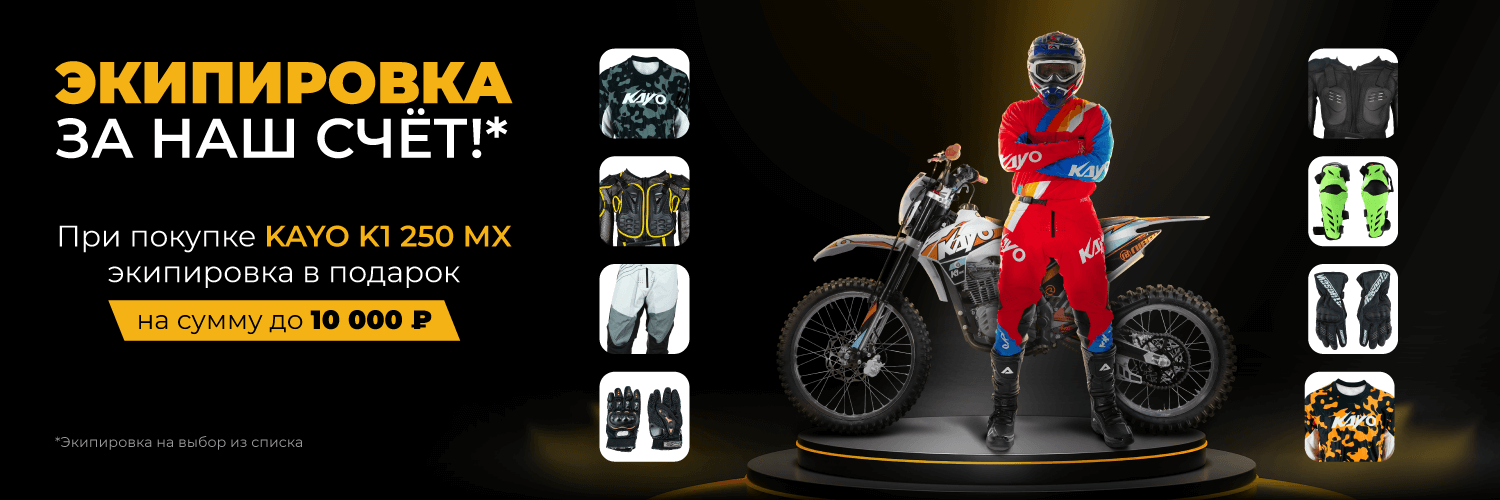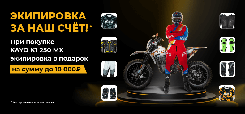 Чтобы снарядить райдеров всем необходимым, запускаем акцию: при покупке KAYO K1 250 MX 21/18 в розничных магазинах Роллинг Мото получите комплект экипировки на сумму до 10 000 ₽.