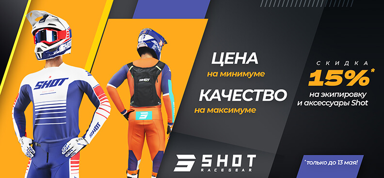 С 22 апреля по 13 мая объявляются беспрецедентные 15%-скидки на весь ассортимент экипировки SHOT: мотокроссовые брюки, джерси, жилеты, куртки, коленные брейсы, перчатки, очки, и, конечно же, шлемы.